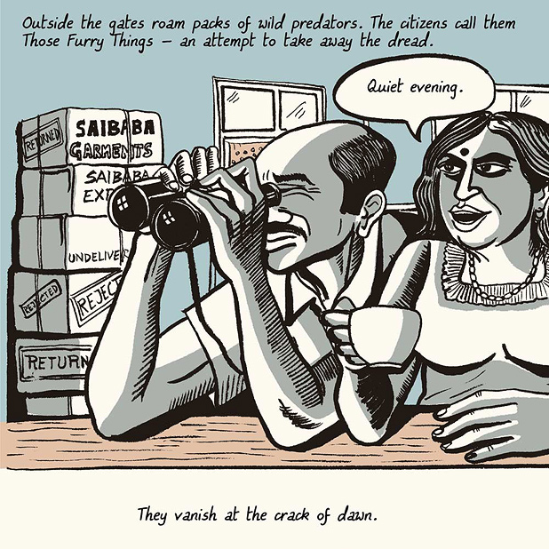 Sarnath Banerjee is an Indian artist—living in Berlin, but often in Delhi, and at home in many cities. He plies image and text to investigate the rhythm of the ordinary, and draw out the hidden caches of humor and wisdom that dwell in the landscape of everyday life. His graphic novels (Corridor, The Barn Owl’s Wondrous Capers, The Harappa Files) depict worlds that are at once exceptional and archetypal, in a manner that playfully articulates the yearning, absurdity, and ecstasy of our shared existence.
